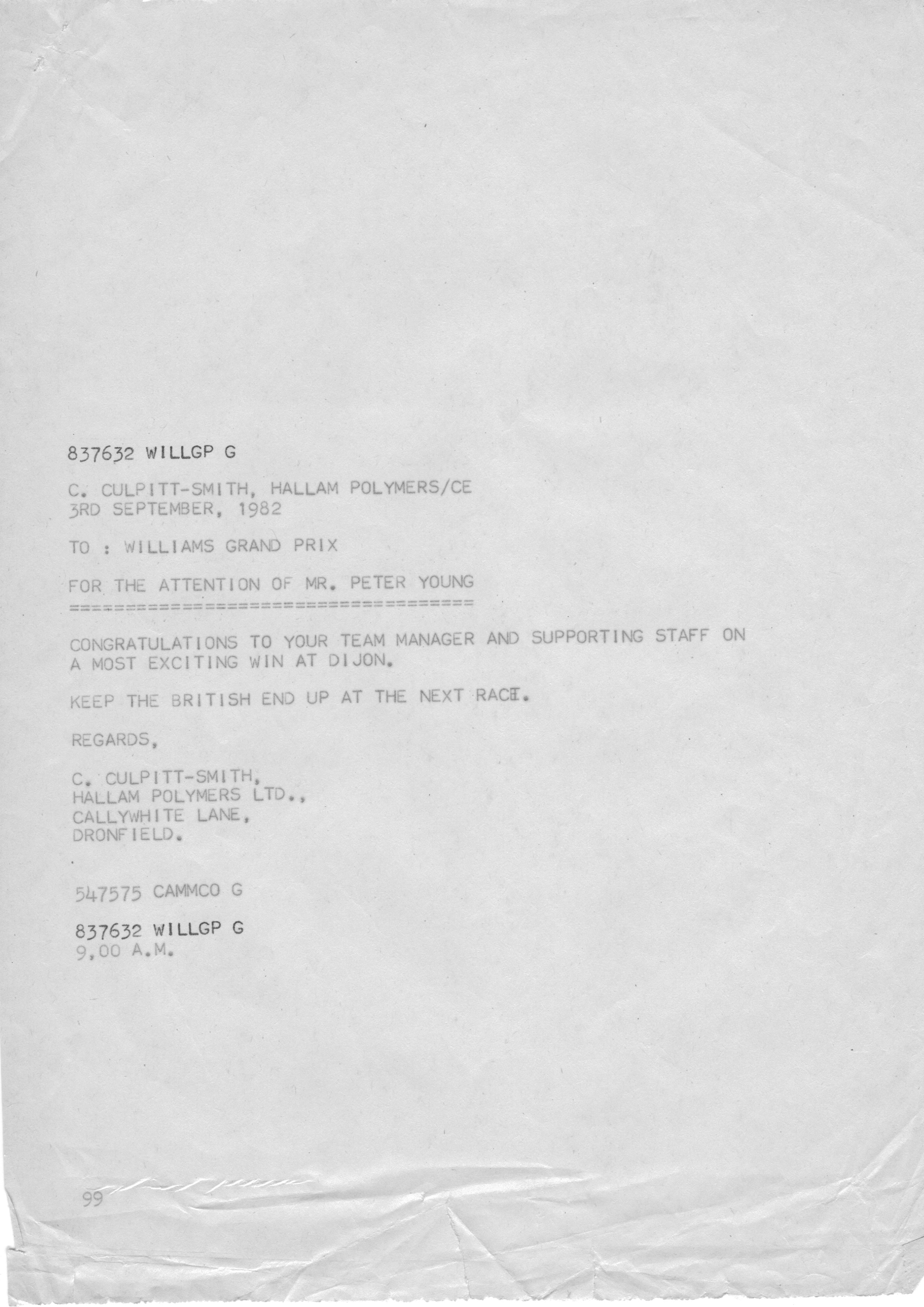So while I’m waiting for the technical details to be checked on the next Lotus blog (the reason for the lengthy delay!) we’re jumping ahead a couple of years to 1982 when my father had moved from Lotus and was now Team Manager at Williams who were running Keke Rosberg and Derek Daly.